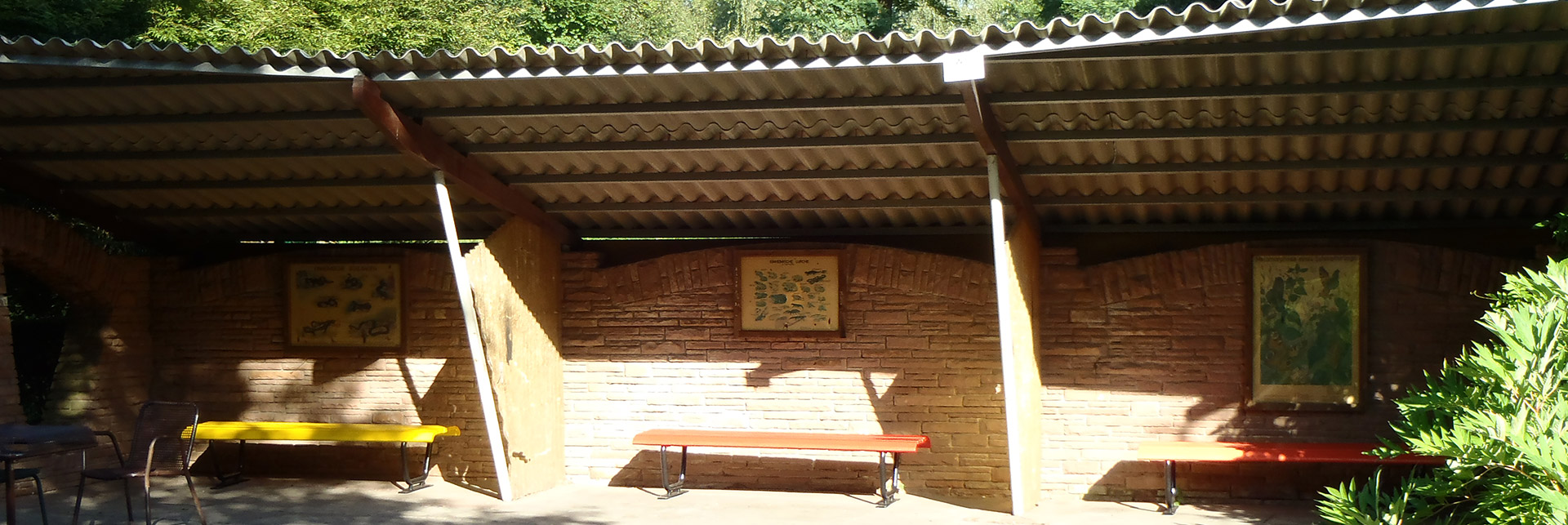 Die ca 170 qm große Fläche ist mit handgeschlagenen Sandsteinplatten ausgelegt. Unter der Überdachung finden Sie Hinweistafeln über die heimische Fauna. In den Pflanzbeeten blühen verschiedene Frühjahrs- und Sommerblumen.