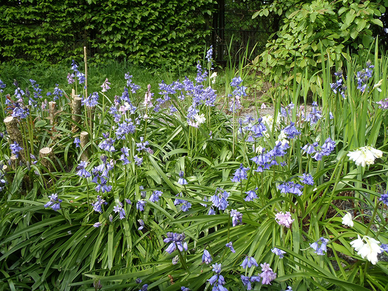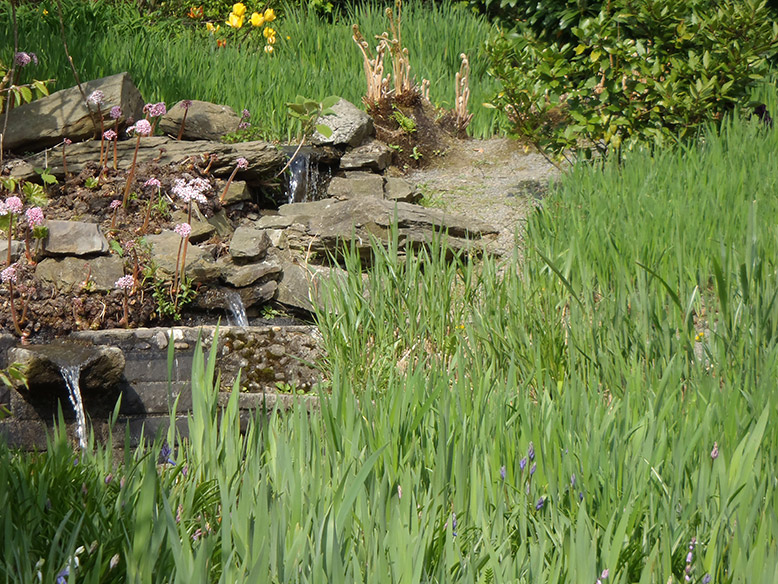 Das Areal beherbert außer den Irissorten vor allem die Taglilie, die Prachtscharte, die Junkerlilie und den Sumpfknöterich, der wegen der grasartigen Blätter und ähnlicher Standortansprüche hervorragend zu den Iris passt. (Blütezeit von April bis Mai / Juni). Hinter der Sitzbank ist auch der Liebesperlenstrauch zu finden.